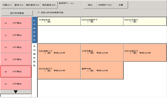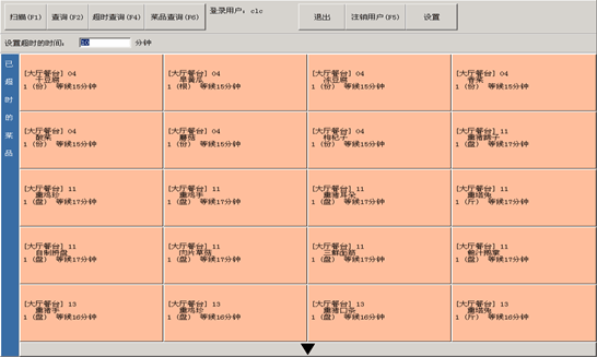 規范上菜標準:在系統中,可以設置上菜的先后次序、每個菜品的各自標準制作時間;系統在掃描的時候,會自動判斷該餐桌下,如果有應該更早上的菜而沒有上,系統就會彈出一個對話框提醒操作員,詢問操作員是否要繼續完成上菜。操作員可以選擇上菜,也可以選擇等一會兒再上。每個菜品下單后,系統自動開始計時,到了該菜品的標準制作時間還沒出廚房,系統會讓該菜品的按鈕閃爍提醒傳菜管理人員,并且,有一個單獨的欄目顯示所有超時的菜品。控菜人員可以根據這樣的標準,主動催促相應檔口趕快制作,而不是等客人不耐煩來催菜。