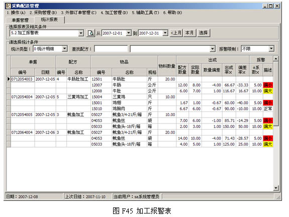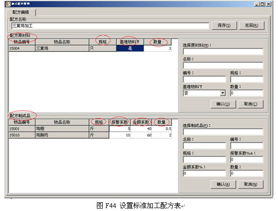 如圖F44, 以一個三黃雞加工標準配方為例來說明: 原料是三黃雞,規格是只,也就是說,采購的時候,三黃雞論只賣(只是舉例),標準是3只雞經過加工,需產出0.5斤雞翅和2斤雞胸肉,同時,雞翅產出率的合理波動幅度是正負5%,雞胸肉的合理波動是正負10%,超過這個標準,系統都會報警。