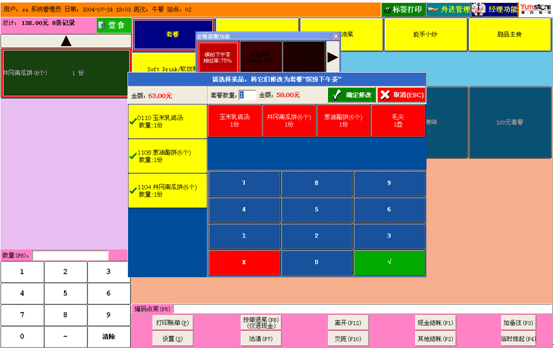 支持套餐點擊和套餐提醒功能:易石允許設置多套帶選擇性的套餐,比如套餐內的飲料可以3選1、配菜2選1等等規則,服務員可以非常方便快速的錄入套餐,同時主動向客人詢問必要的問題。如果當客人選擇零點產品,而該產品(一個或多個)屬于某個套餐范圍內的,系統用不同程度的顏色狀態來提醒點單員,可以建議客人改選相應的套餐,從而達到多賣產品的目的。